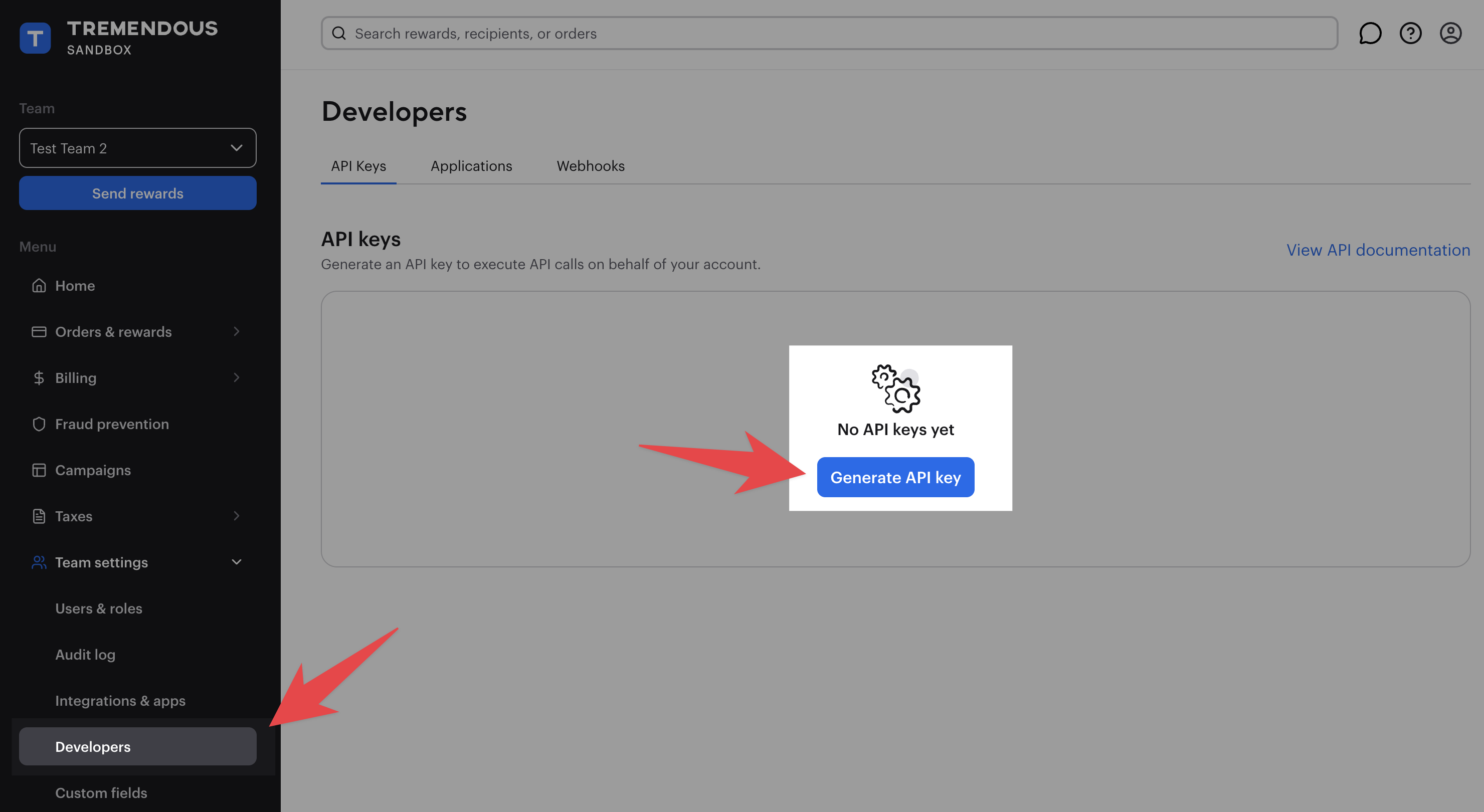 You can generate an API key through the Tremendous dashboard under Team Settings > Developers.