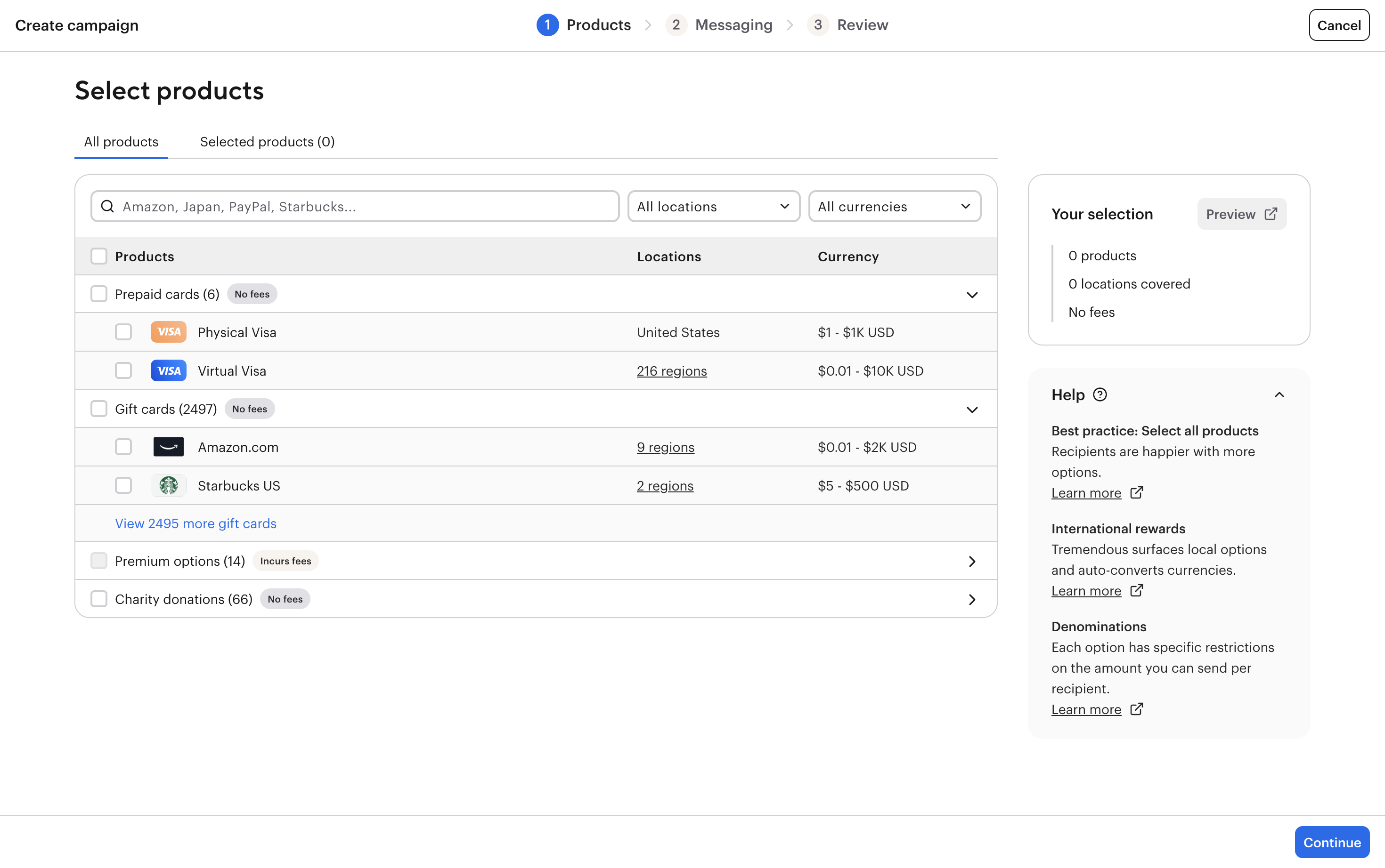 Tremendous manages the complexity of the payout option selection interfaces for you. We only show relevant products in a user’s country, that work with the denomination of the reward.