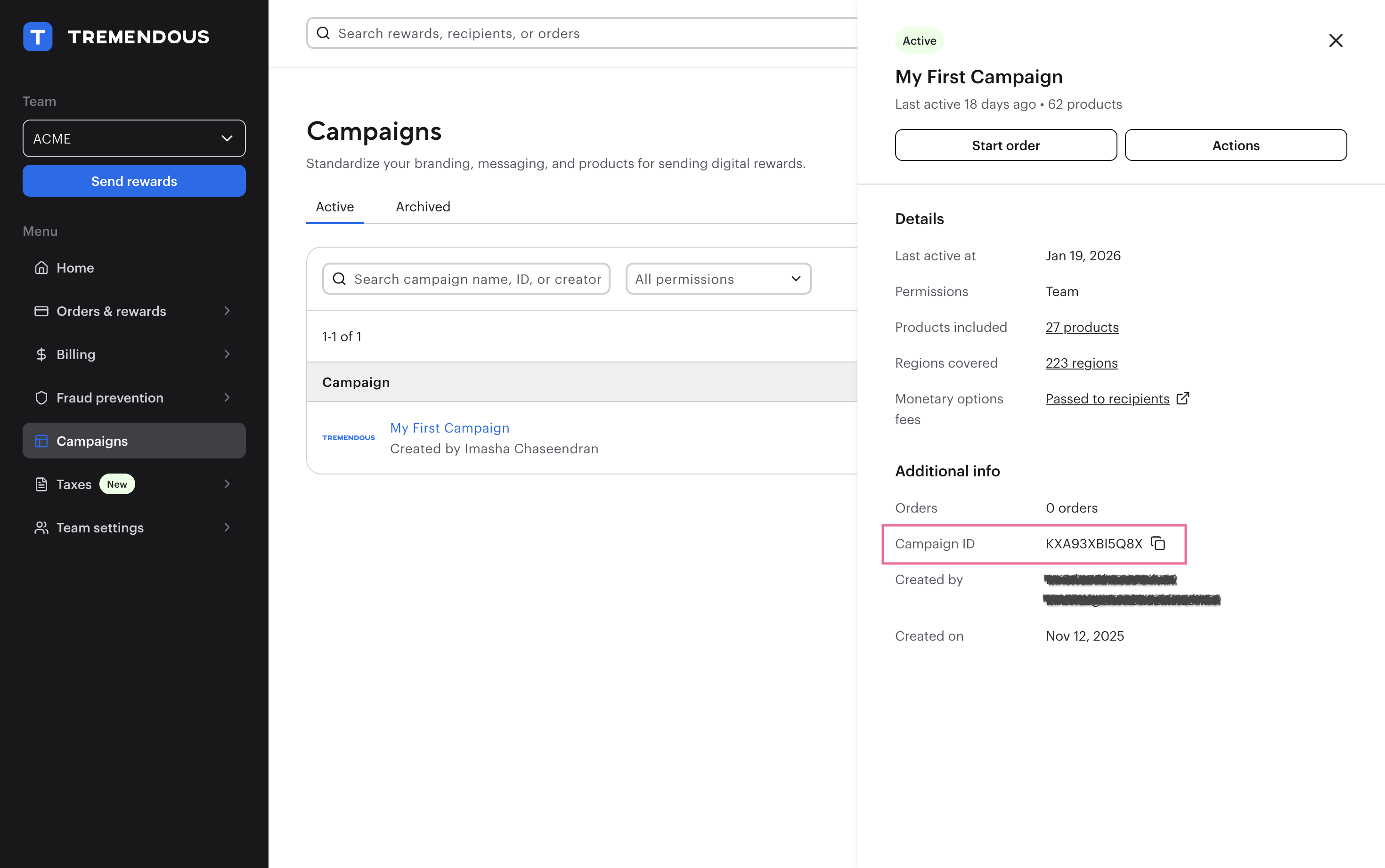 Campaigns are reusable templates that group together design, copy, and payout method settings for rewards. They’re created in the Tremendous Dashboard, and are useful when you're sending similar rewards to different recipients over time.