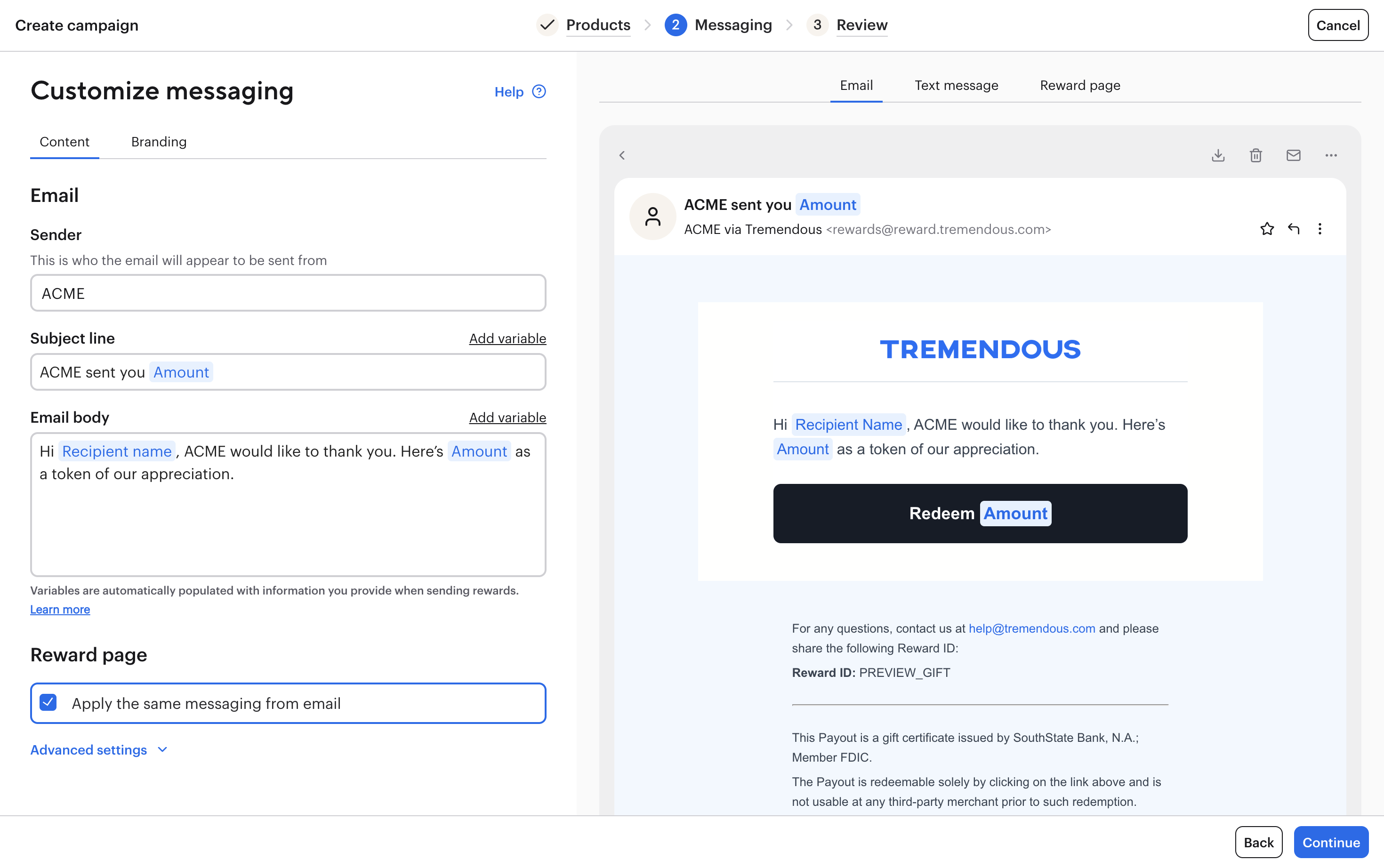 By using campaigns, you can insert your organization's branding into the reward, and customize the copy that your recipients will see.