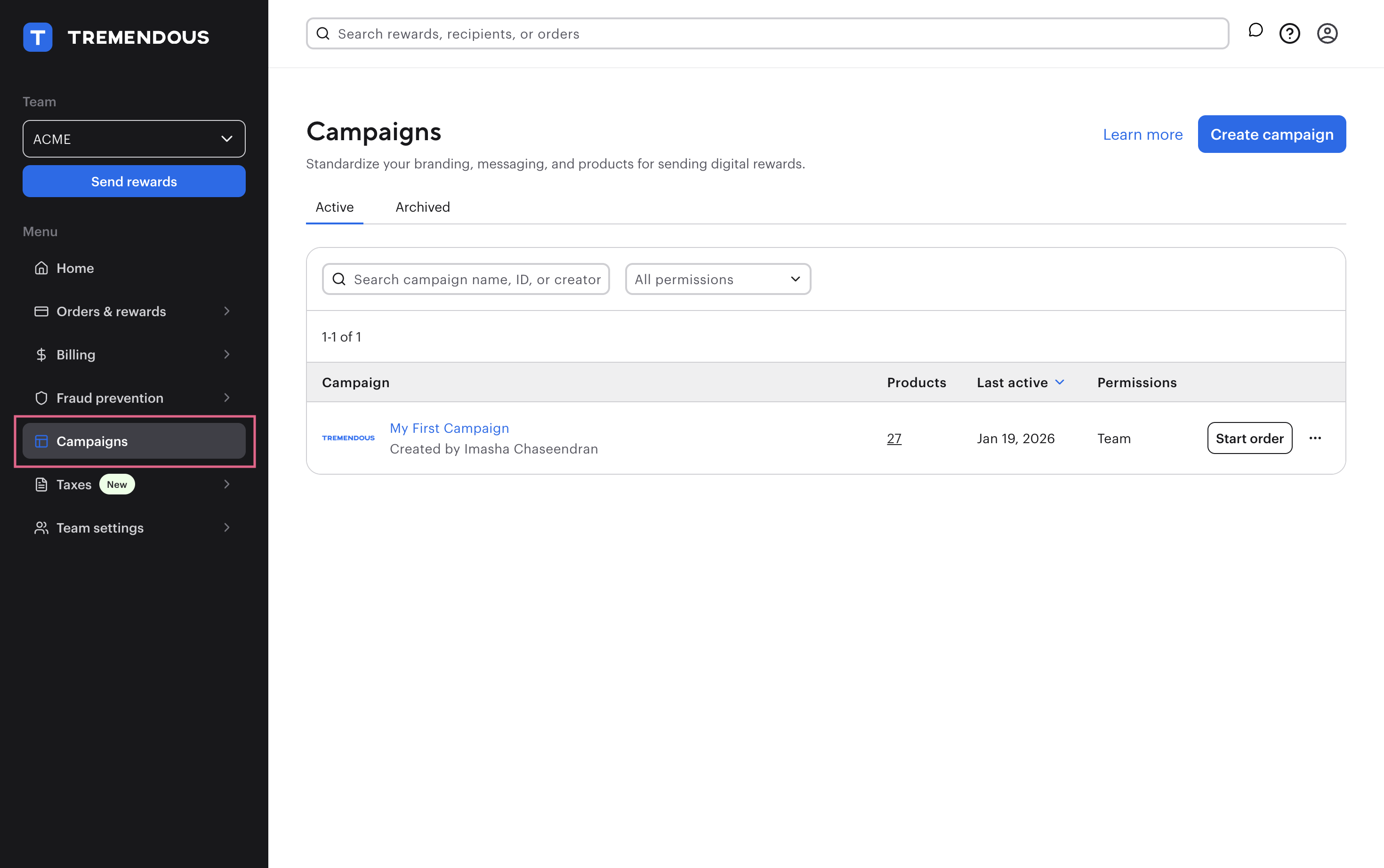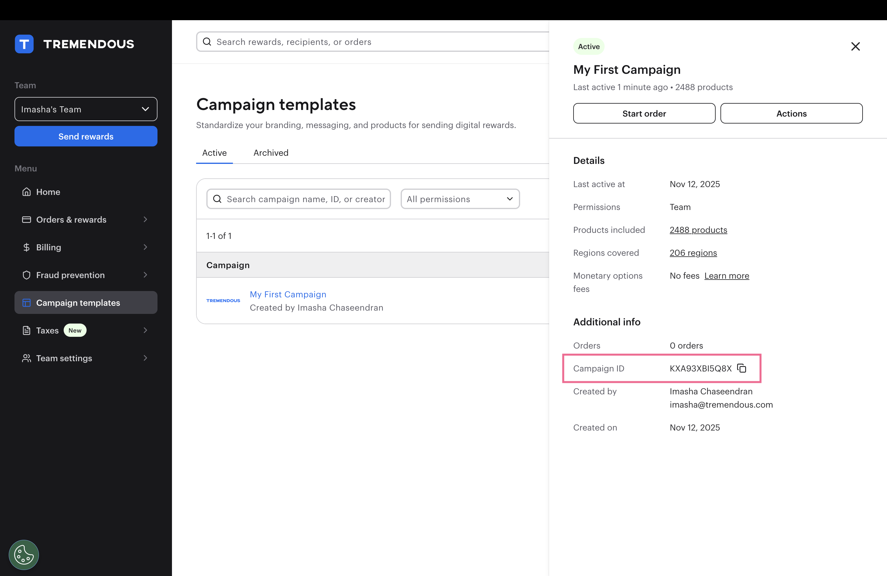 --url 'https://testflight.tremendous.com/api/v2/campaigns'It will return a response similar to what's shown below. Grab the ID of the campaign that you'd like to use.